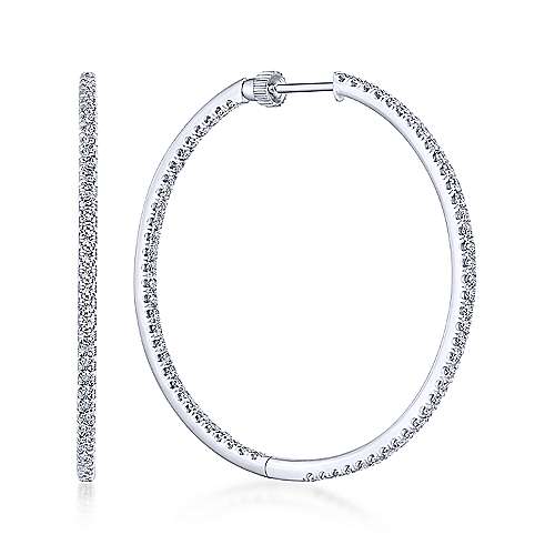 Elevate your look with the breathtaking brilliance of these Gabriel & Co. diamond hoop earrings. Featuring 2.08ctw of diamonds, these 40mm hoops are meticulously crafted in polished 14k white gold. The innovative “inside-out” design ensures every angle dazzles, catching the light from both the front and inner back for unparalleled glamour.