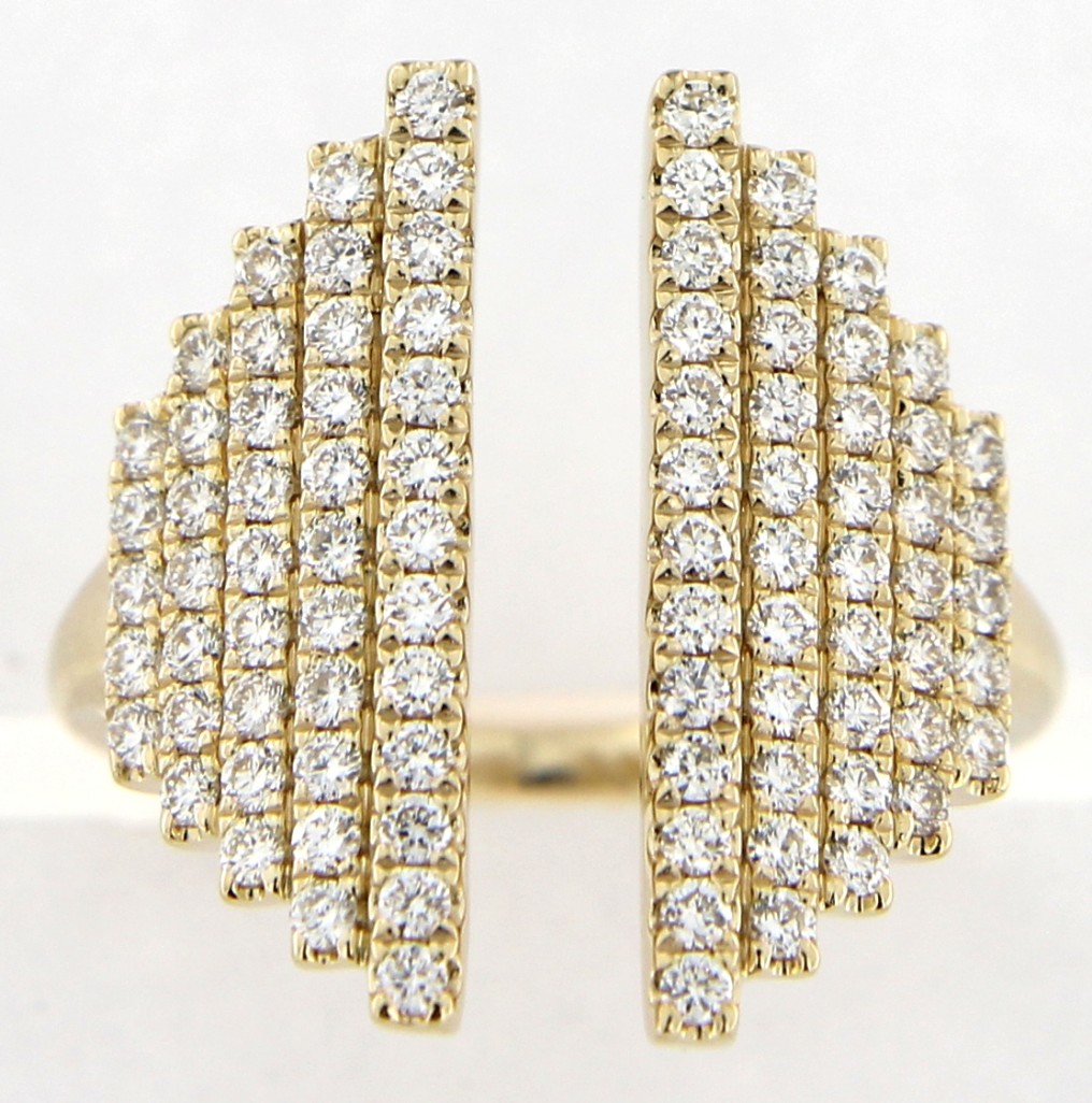 Elevate your style with this breathtaking Gabriel and Co. open ring. Expertly crafted in 14 karat yellow gold, the design features striking graduated rows of shimmering diamonds totaling 1.02 carats. Its bold, architectural silhouette makes a sophisticated statement of modern luxury.
