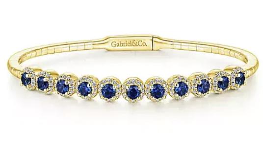 Indulge in the breathtaking allure of this Gabriel & Co. masterpiece. Crafted in14K yellow gold, this exquisite bangle showcases 1.39ctw of blue sapphires. Each gem is framed by a shimmering halo of brilliant diamonds, creating a spellbinding contrast that radiates luxury from every angle. Featuring 0.50ctw of SI-quality diamonds, this 6.25-inch treasure is a true showstopper. Whether worn as a bold standalone piece or layered with your favorites, it serves as a timeless symbol of sophistication. Elevate your style with this iconic blend of grace, fire, and effortless elegance.