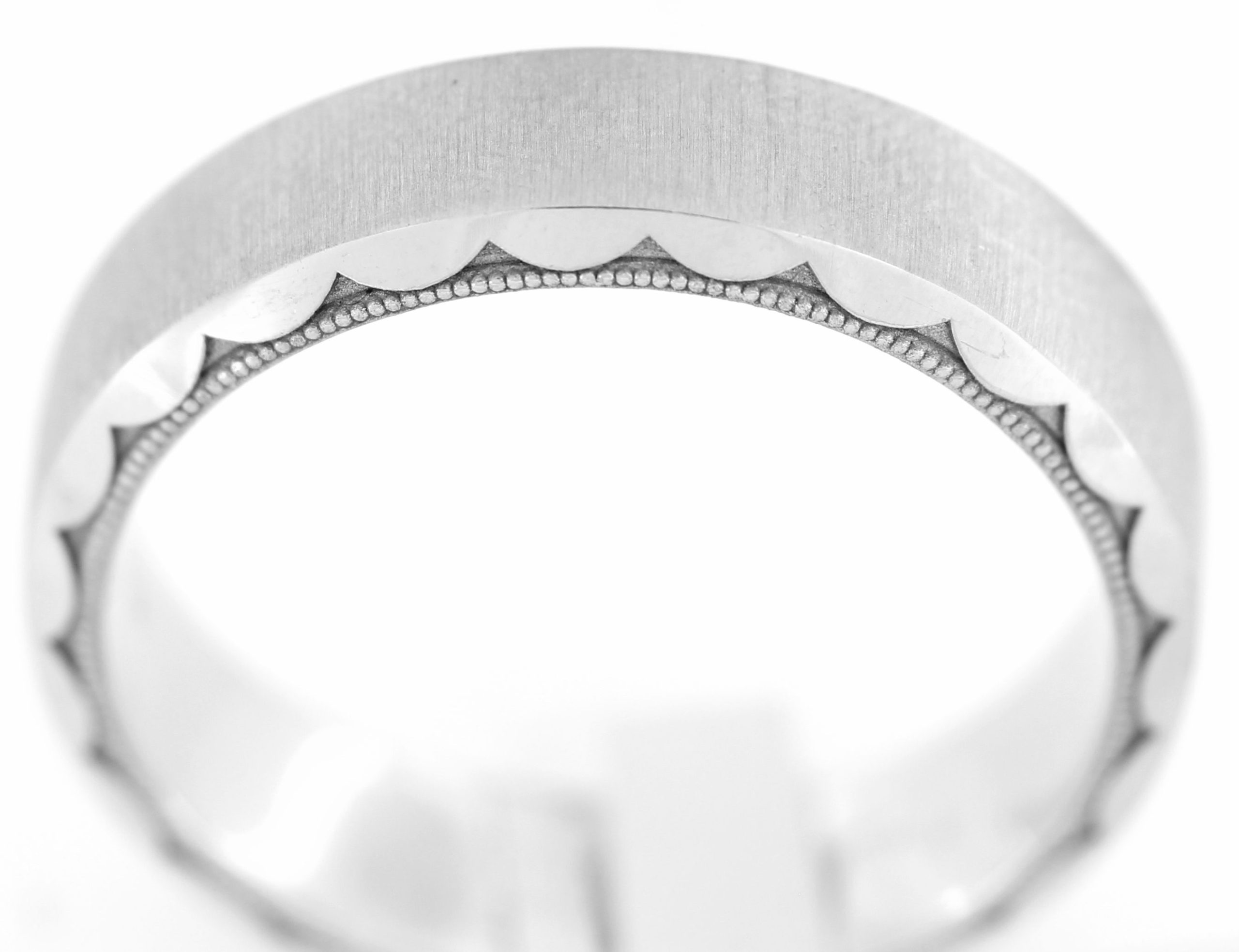 Experience the height of modern luxury with this 18K white gold TACORI wedding band. This 6mm band features a contemporary flat profile and a refined satin finish, offering a sophisticated, matte look for the modern groom.