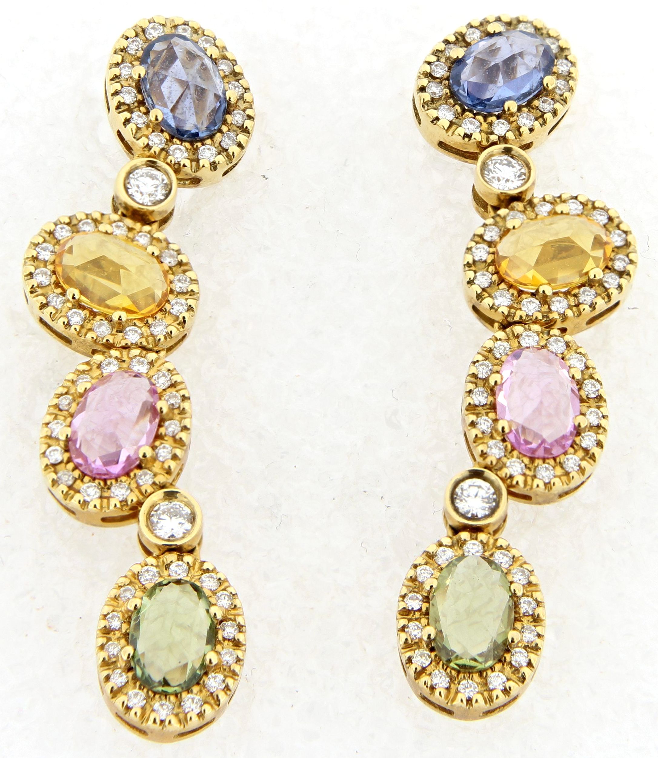 Ignite your style with these breathtaking 18K yellow gold dangle earrings. Featuring a vibrant cascade of 4.68 carats of multicolored oval sapphires, these earrings celebrate a radiant rainbow of luxury. Each gem is haloed by brilliant diamonds, creating a dance of light that frames your face with elegance. Masterfully crafted, these treasures boast 0.86 carats of diamonds that perfectly complement the warm gold settings. Elevate your collection with this exquisite fusion of high-fashion artistry and timeless brilliance.