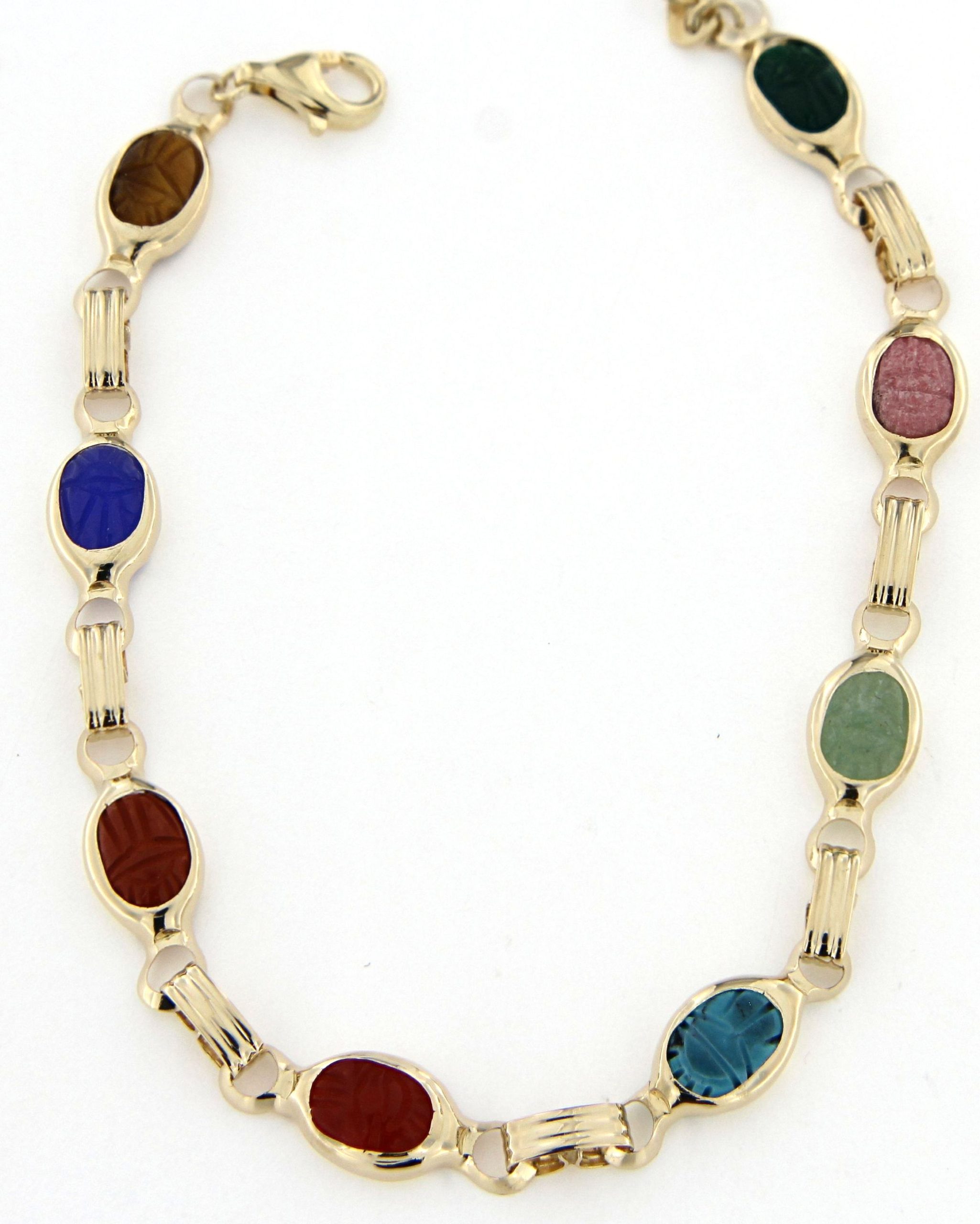 Embrace timeless charm with this stunning previously owned 14k yellow gold scarab bracelet. Featuring vibrant, multi-colored stones carved to symbolize protection and renewal, this piece captures the allure of ancient-inspired design and rich craftsmanship. Measuring 7.25 inches, this classic link bracelet offers a comfortable, elegant fit. Add a splash of color and unique history to your jewelry collection with this exquisite find.